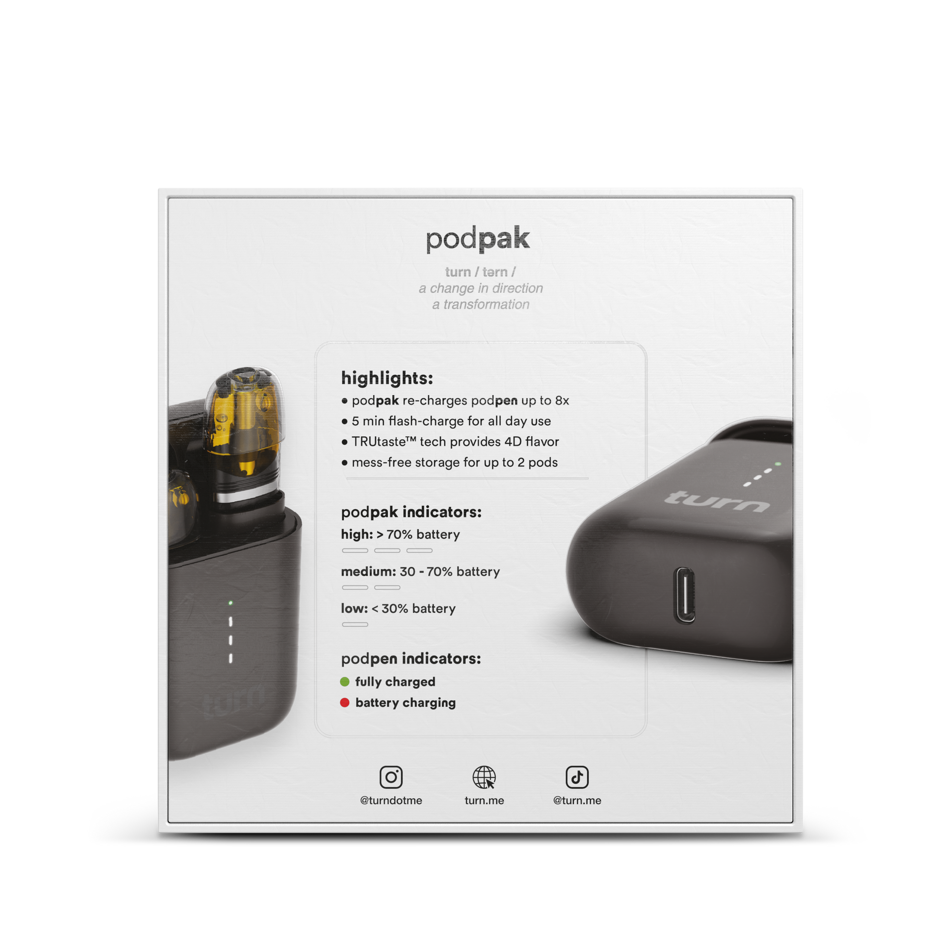 Double up on everything you love about vaping with the turn podpak battery case. With space for your podpen (included), main flavor pod + a backup pod, you’ll always be ready to rip.